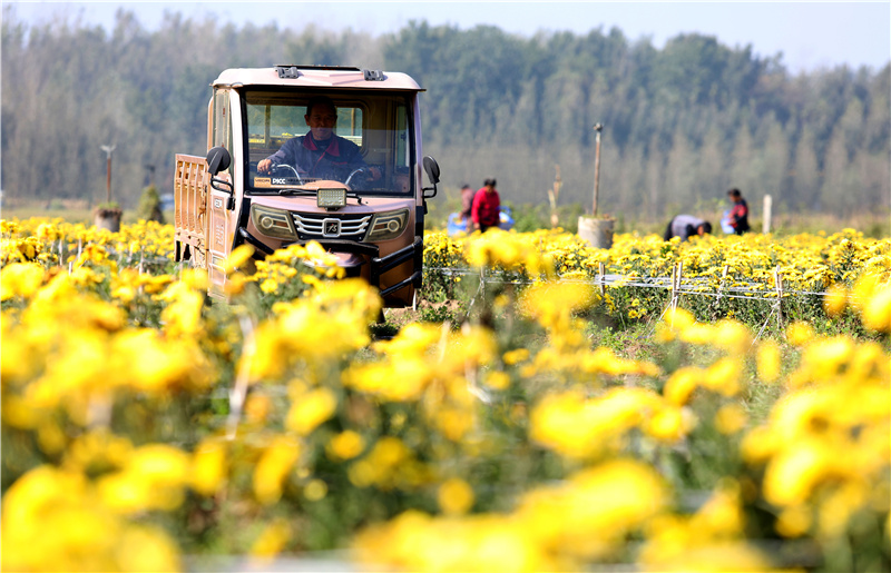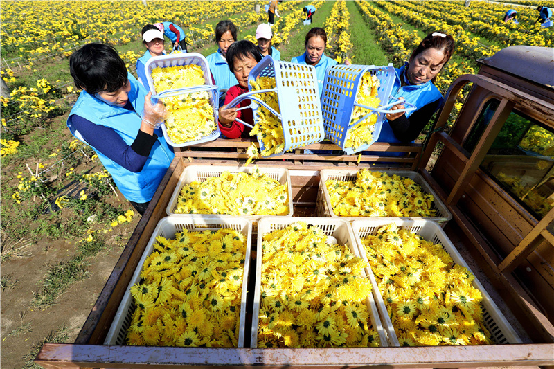 10月8日,在河北省行唐县一家皇菊花种植基地,农户将采收的皇菊花装车。