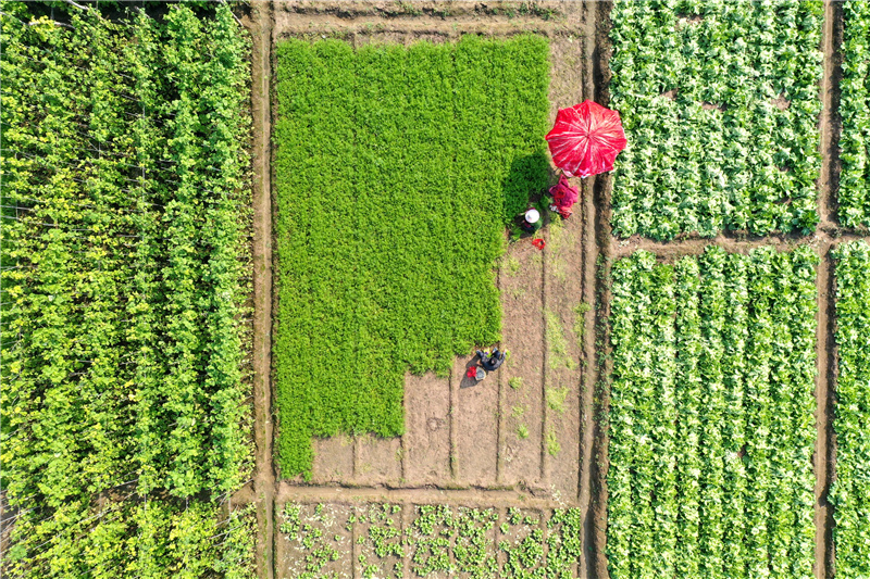 10月8日,在河北省石家庄市栾城区栾城镇北浪头村,菜农在采收茴香(无人机照片)。