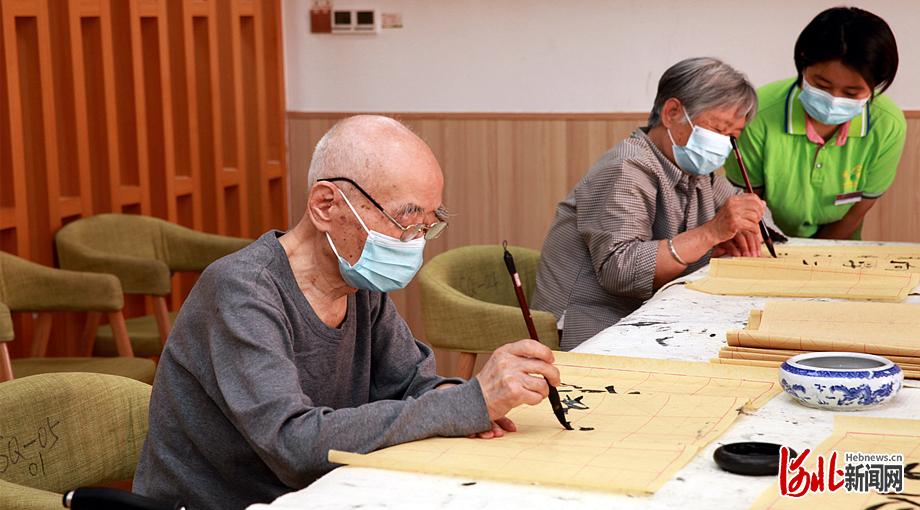 近日,在石家庄市桥西区振头街道综合养老服务中心,老人们在练习书法。 通讯员张文静摄