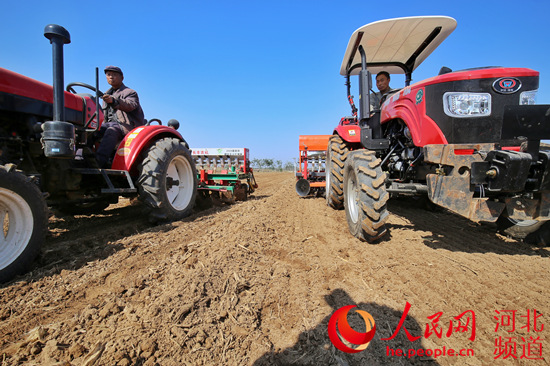 魏县爱耕农业种植合作社2台播种机开始播种小麦,其中一台是省里新支持的电子数控精量播种机。 蒿群英摄