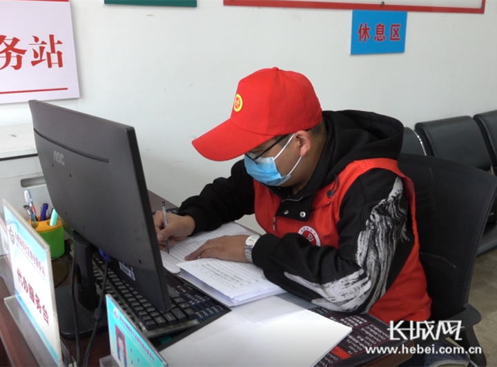 邢台市襄都区牛市新街社区“跑腿儿哥”丁文凯填写社区代办服务台账。 长城网记者 魏亚慧 摄