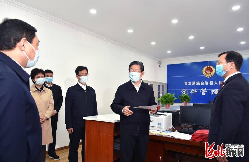 10月23日,省委书记、省人大常委会主任、省政法队伍教育整顿领导小组组长王东峰在秦皇岛市青龙满族自治县调研检查。这是王东峰在青龙满族自治县检察院听取教育整顿工作汇报,了解检察院重点工作。 河北日报记者赵海江摄