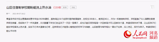 人民网石家庄10月29日电 9月7日,秦皇岛网友在人民网“领导留言板”中留言求助,称秦皇岛市抚宁区台营镇麻姑营中学是一所山区寄宿制学校,全校在校生300多人,因为学校没有洗澡堂,孩子们每天运动后一身臭汗,不能洗澡,只能忍到每周回家的时候才能洗。希望能够解决这个问题。