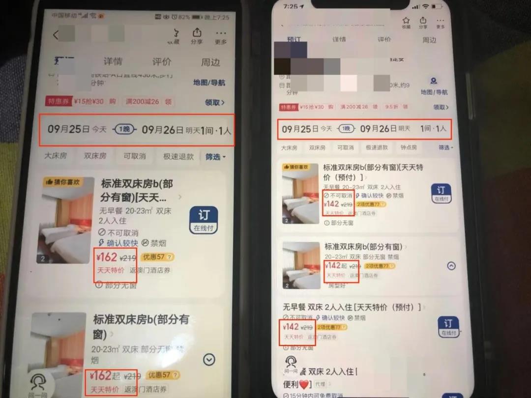 同一时间用某APP预定某酒店的同房型时,不同手机端显示的价格不同,这就是典型的大数据杀熟。