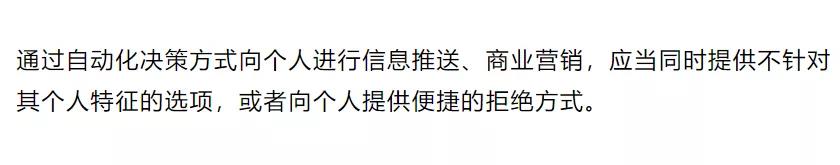 个人信息保护法对此作出明确规定:个性化信息推送,应提供便捷的拒绝方式