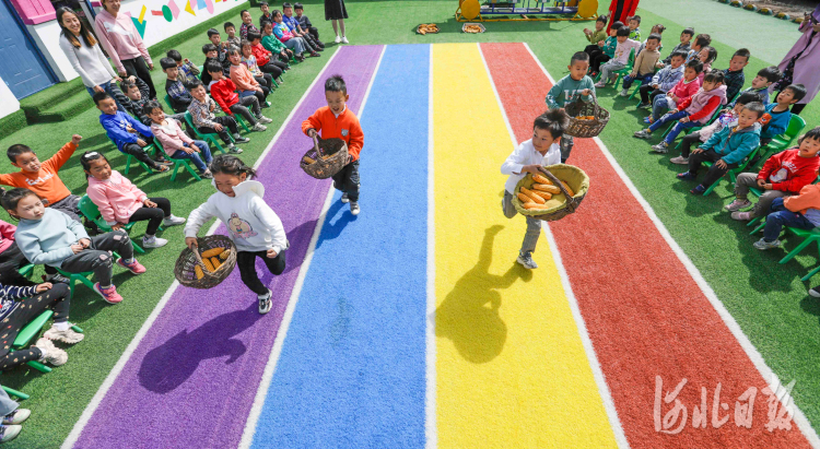 4月29日,河北省遵化市东旧寨镇中心幼儿园的孩子们在参加运送玉米比赛。河北日报通讯员刘满仓摄