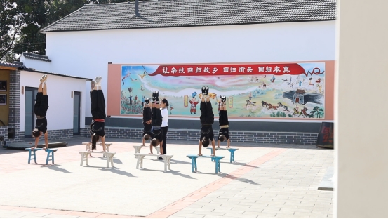 日头爬过屋檐,上午十时,吴桥县桑园镇小第九村刁家班杂技小院已是一派生机勃勃。随着杂技老师杨帅在院中一声令下,顶碗、翻跟头、倒立……学生们开始了一天的训练。