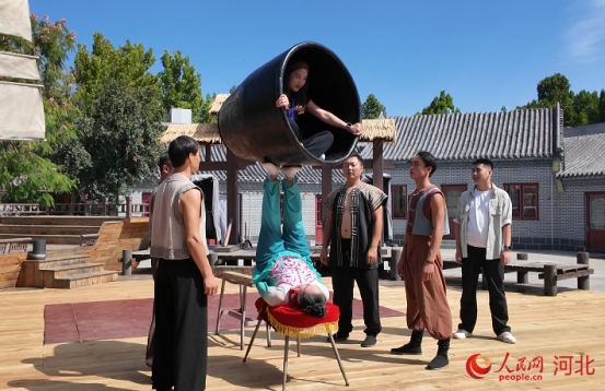 吴桥杂技大世界江湖文化城内的蹬缸表演。人民网记者方童摄