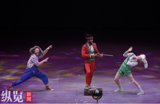“是谁?”“是他!”俄罗斯“不穿袜子组合”两次登场,红色皮衣,绿色连体裤,黄色爆炸头……滑稽的装扮瞬间吸引全场目光,还会说一些简单的中文与现场观众互动,点燃现场气氛。他们集诙谐幽默与杂技技巧于一身,趣味横生的表演,把观众逗得前仰后合,笑声不断。