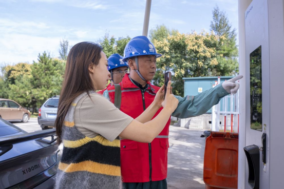 图为电力工人在荣乌高速涞源服务区指导车主使用快充枪充电