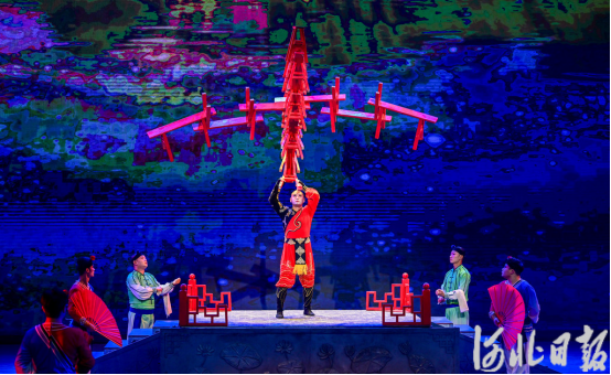 9月28日,“为人民绽放——国家艺术基金优秀杂技节目展演”在吴桥江湖大剧院举办,安徽省杂技团演员正在表演《顶板凳》。