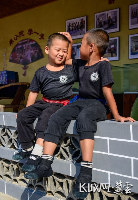 哥哥靳宇航(7岁)轻轻摸着弟弟靳宇健(6岁)的头,互相加油鼓劲。