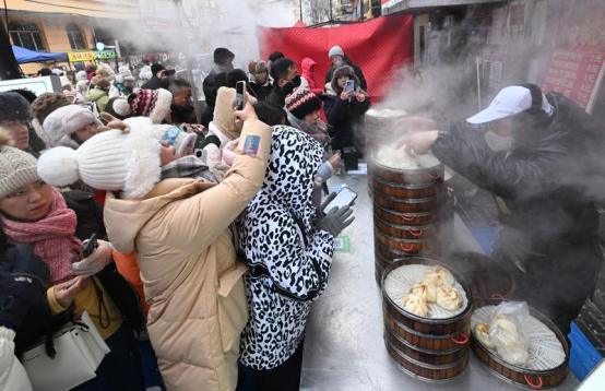 2025年1月28日,在哈尔滨市红专街早市,游客排队买包子。
