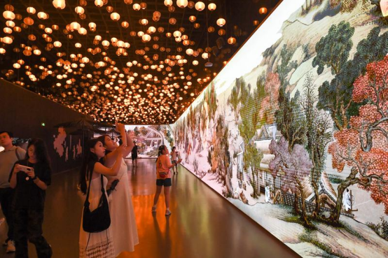 2025年8月20日,游客在江苏省南京市新街口一家商场内观赏拍摄“金陵图数字艺术展”。