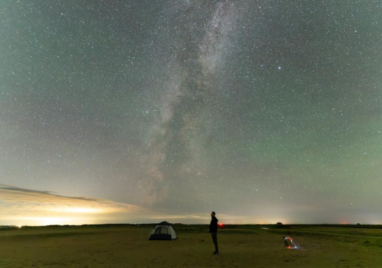 2025年8月21日,在黑龙江省佳木斯市桦川县,星空摄影爱好者在观赏银河和两侧的牛郎星、织女星。