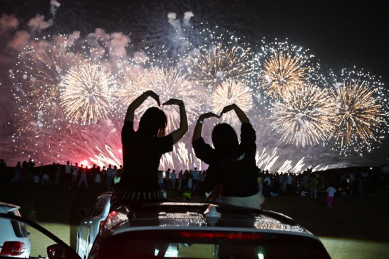 2025年8月10日,游客在宁夏中卫市沙坡头区观看烟花表演。