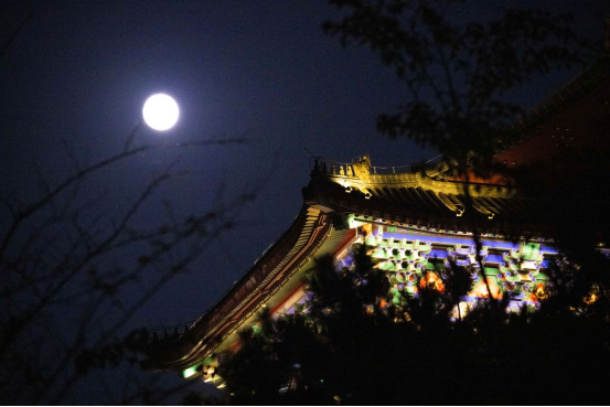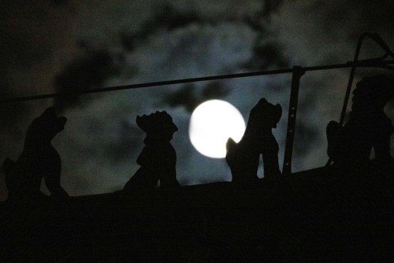10月6日晚,定安阁檐角上的神秘“屋脊兽”与中秋圆月相映成趣。