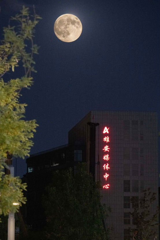 10月6日晚,中秋圆月悬挂在雄安媒体中心大楼之上。