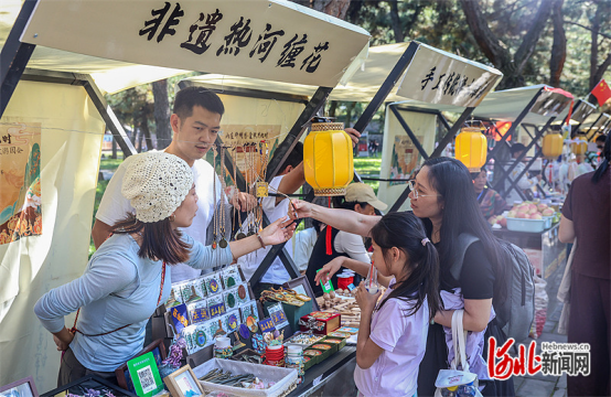 10月3日,游客在承德避暑山庄文化市集购买商品。