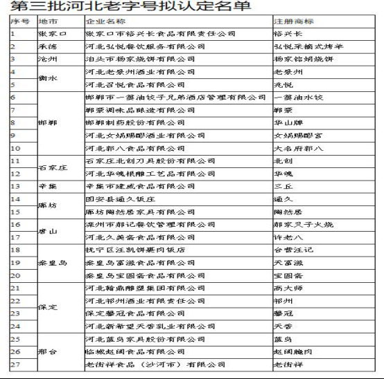 经各市推荐、专家评审、现场核查、部门研究,拟认定张家口市裕兴长食品有限责任公司“裕兴长”、河北弘悦餐饮服务有限公司“弘悦采摘式烤羊”等27个第三批河北老字号品牌;同时,按照河北老字号动态管理有关规定,对认定满2年的72个第一批河北老字号品牌进行复核,形成复核结果。