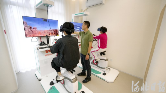10月9日,在雄安新区容东片区龚庄社区党群服务中心“幸福空间”的VR单车运动空间,社区居民正戴着VR眼镜“骑行”。