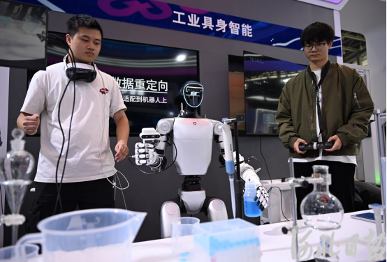 在中国联通展区,一台具身智能机器人正有条不紊地做着化学实验。