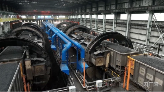 “轰隆——”刚走进三期翻车机机房,沉闷的机械运转声便从头顶传来。抬头望去,一列重载列车正缓缓驶入O型翻车机的“怀抱”,4节车厢被牢牢固定后,伴随着液压系统的精准发力,车厢以160度角缓缓翻转,8000吨煤炭如黑色瀑布般倾泻而下,却不见半分煤尘飞扬。