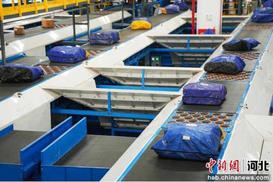 图为廊坊市广阳经济开发区中通快递北方总部分拣中心进港库内,分拣设备高速运转。