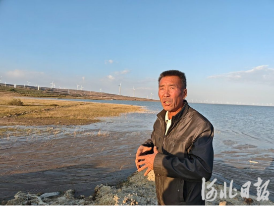 10月16日,张北县海流图乡邢地湾村村民张宏柱在安固里淖岸边,讲述水体恢复的过程。