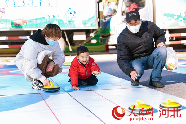 在正定县塔元庄村,小朋友在家长的带领下体验陆地冰壶。 主办方供图