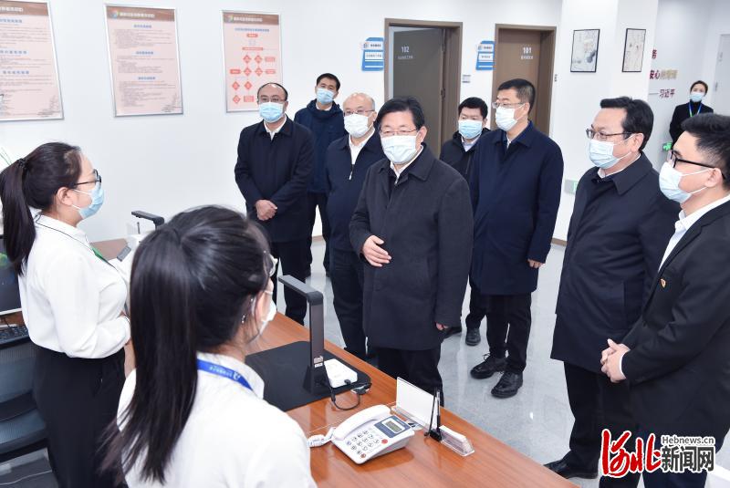 12月4日,省委宣讲团团长、省委书记、省人大常委会主任王东峰到雄安新区宣讲党的十九届六中全会精神并调研检查。这是王东峰、王正谱在胡村社区党群服务中心,看望慰问社区工作者。 河北日报记者赵海江摄
