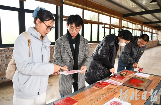10月22日,在保定市华融纸厂,参观者体验版画制作。
