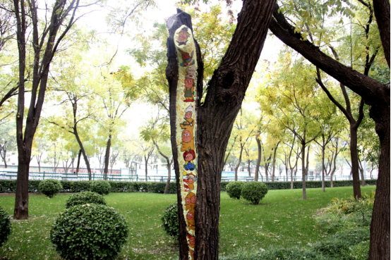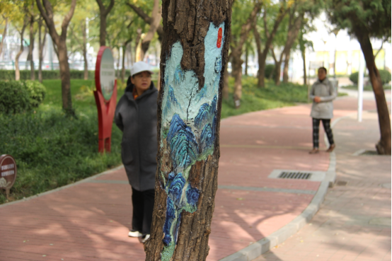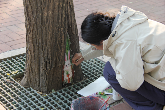“在进行彩绘之前,我们经过多次实地考察,根据每个树洞不同的形状、大小和位置,巧妙构思,将自然元素、传统文化、现代图案等元素融入创作中,使得每一个树洞都变成独一无二的艺术作品。”志愿者刘文豪介绍。现场围观的市民关心志愿者们所用颜料的环保问题,对此,志愿者孟凡涛一边调色一边耐心地解释说:“作画选用的无甲醛丙烯颜料安全环保,不仅不会伤害树木,还具有一定的保护膜功能,可起到修缮、遮盖、保护、防止创口水分流失的作用。而且效果持久,至少可以保存2年。”