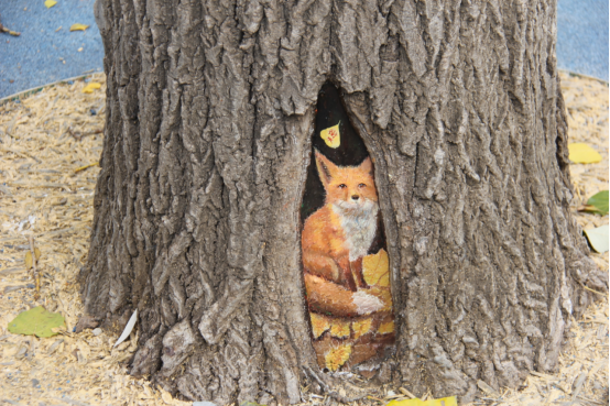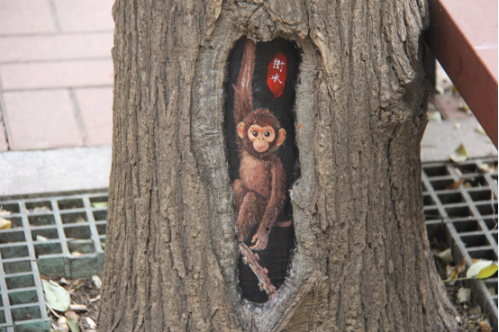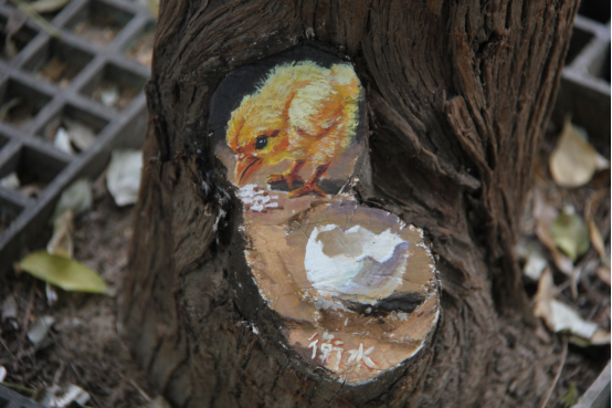 除了这只“小鸡”,小鹦鹉、小狐狸等形象也纷纷“藏身”树洞,不少人停下脚步,拍照欣赏。不远处,志愿者们正俯身执笔,让原本沉寂的树洞焕发出艺术的温度,让这里的树洞成为市民逛街时的意外惊喜。志愿者王若昀说:“一些树木因年久或外力因素形成了大小不一的树洞,我们希望让这些‘受伤’的树木重新焕发生机!”