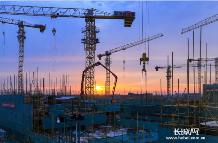 雄安新区建设工地塔吊林立,20余万建设者昼夜奋战,一派热火朝天的景象。资料图