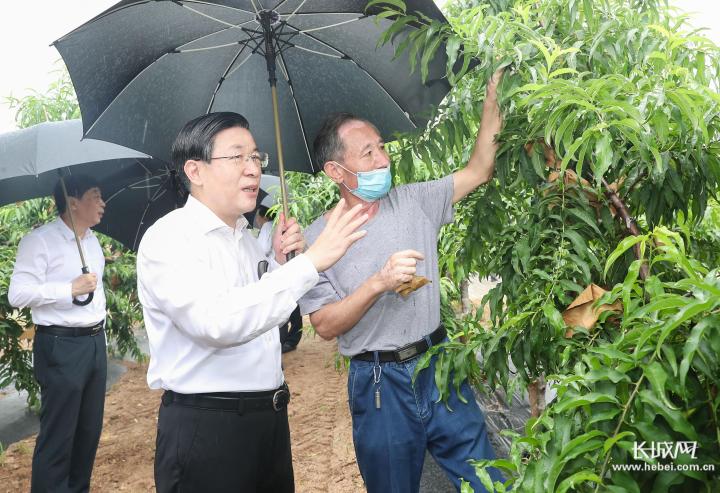 按照省委统一部署,2020年7月16日至17日,省委书记、省人大常委会主任王东峰到联系点保定市调研检查。这是在阜平县平阳镇立彦头村林果基地,王东峰主动撑起雨伞,与刘济伟教授一同走进果园,察看水果长势。长城网·冀云客户端记者 张瑞雨 摄