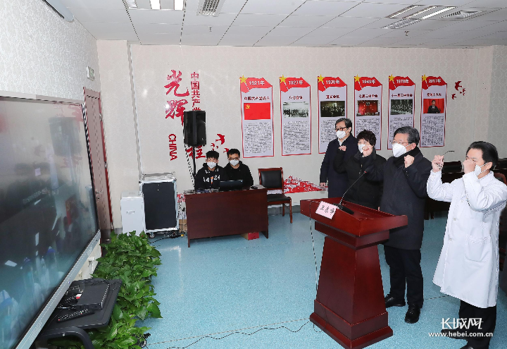 2021年1月12日下午,省委书记、省人大常委会主任王东峰在石家庄市调研检查。这是王东峰来到医院,通过视频与隔离病房的医护人员进行连线,并向专家组和医护人员表示衷心感谢,致以崇高敬意。长城网·冀云客户端记者 张瑞雨 摄