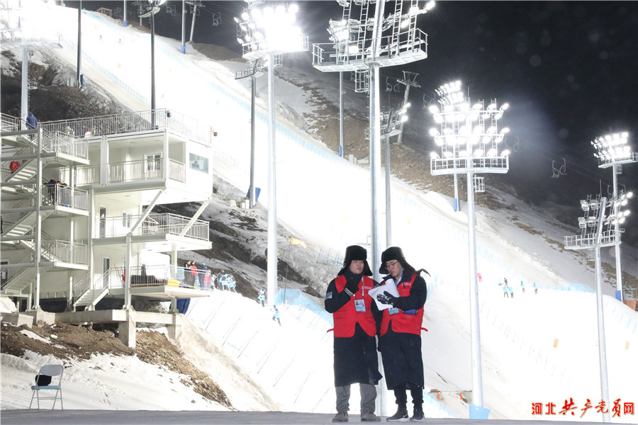 冬奥测试赛期间在云顶滑雪公园,冬奥保障队员开展赛前巡视巡查工作/ 贾函 摄