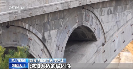 赵县博物馆馆长 李坤红:敞肩拱的创举是赵州桥最伟大的发明。在此之前,石拱桥桥肩上面大都是用石头填满,沉重且阻水。而李春创造性地在赵州桥的肩上面设计了一大一小两个拱,这便是“敞肩拱”设计。