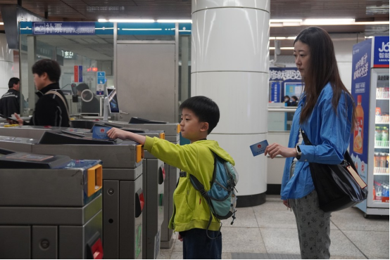 5月1日,在北京地铁7号线进站口,保定市民范芮洁(右)和儿子掏出各自的社保卡,将其贴在闸机感应区,顺利乘坐北京的地铁。