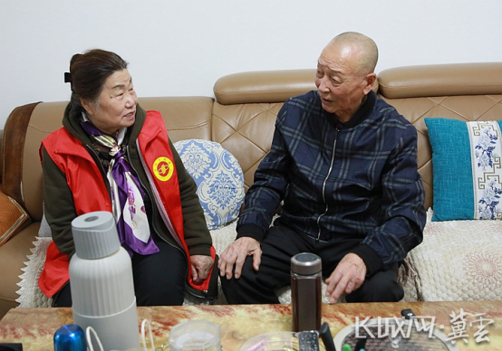 滨河社区志愿者岳淑荣到金聚海(右)老人家做志愿服务。