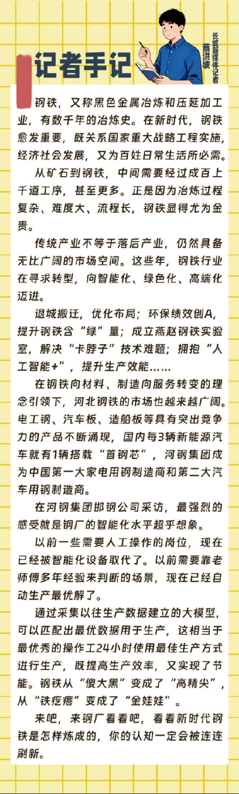 从普通钢的供应商,到汽车用钢“整车造”,河钢集团邯钢公司通过拥抱新技术,让老钢厂焕发出新活力,一块块“铁疙瘩”变成了一个个“金娃娃”。AI时代,传统钢铁靠什么突围?“一块钢”经历了怎样的蝶变?请跟随记者的镜头一探究竟。