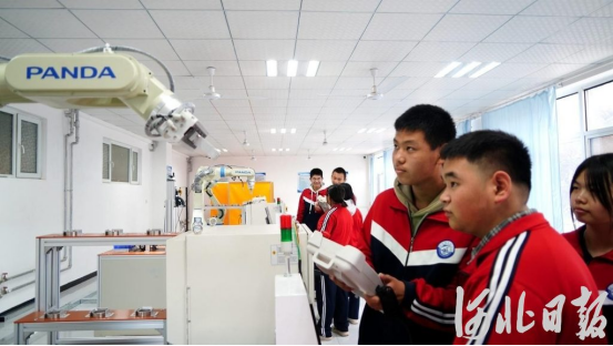 在河北临西县职教中心工业机器人实训室的综合实训台前,学生们正在操作完成机器人抓取、移动装配等实训任务。