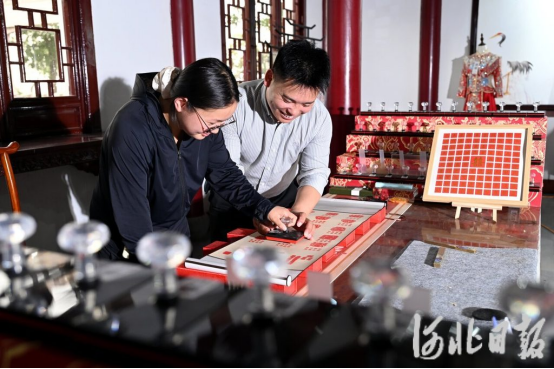 6月21日,冀州区婚姻登记服务中心内,一对情侣一起制作“百喜图”。