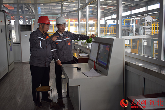 河北工业大学教授王宝奇(左)在河北钢诺新材料科技有限公司查看新产品设备参数。 郭永强摄