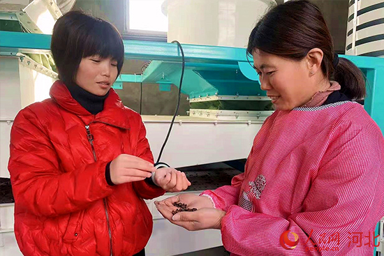邱县乡镇科技特派员刘丹平(左)在企业指导工人开展文冠果果壳粉碎加工工作。 蒋中杰摄