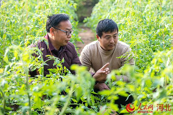12月16日,在河北省邯郸市肥乡区毛演堡镇张村张世玉种植的水果番茄大棚内,对口帮扶的科技特派员张孟军(左)正在指导其进行田间管理。 薛建东摄
