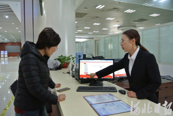 在沧州市政务服务中心,沧州市行政审批局工作人员(右)向办事群众介绍如何便捷获取专项信用报告。