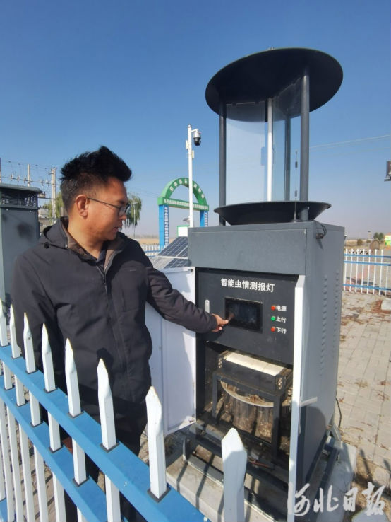 11月1日,唐山市乐亭县数字循环现代农业园区,硬件工程师段严严介绍智能虫情测报灯如何进行病虫害防控。
