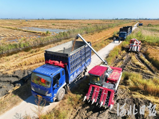 10月14日,唐山市乐亭县数字循环现代农业园区水稻丰收,收割机将水稻装入运输车。
